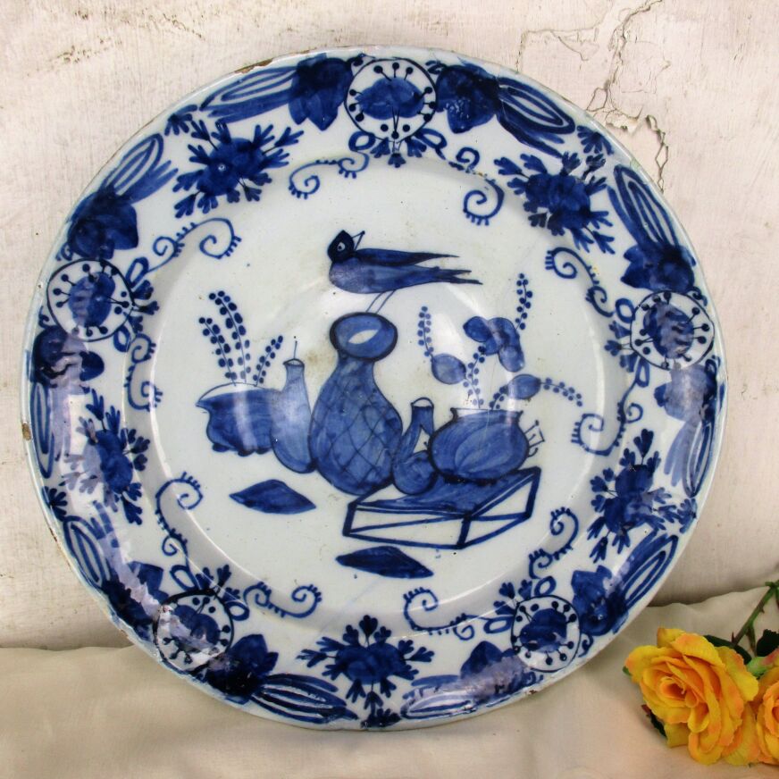 Antique 18th Century Large Delft Charger Plate Blue White Unusual Still Life