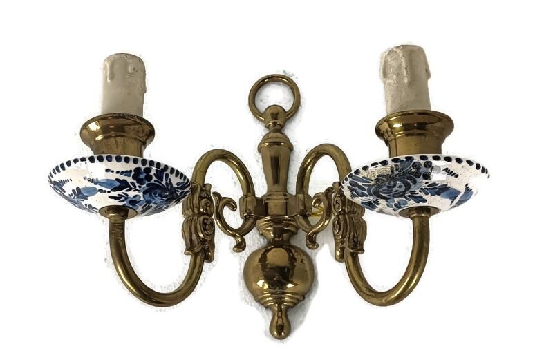 Delft blue white Vintage porcelain brass Two-Arm Double Wall Sconce Light