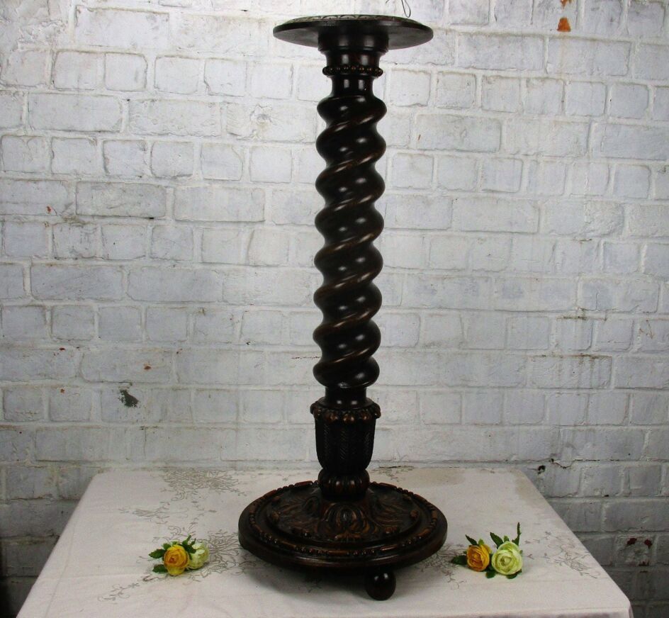 this beautiful hand carved pedestal is 33" (84 cm) high, the table top has a diameter of 9.64" (24.5 cm) and the base has a diameter of 13.38" (34 cm), the pedestal is in overall very good condition, hardly any wear to the wood (for all details please see pictures, the pictures are part of the description)