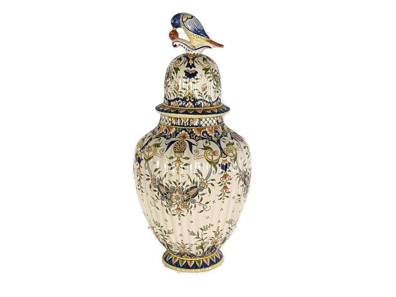 Gorgeous Urn Vase Lidded Bird Knob Decor Rouen France Vieux Rouen Very Rare Vtg