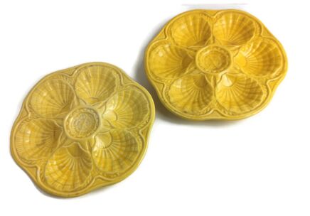 two Yellow Pottery faience Ceramic Oyster Plates Seafood Crab Vintage Mid century