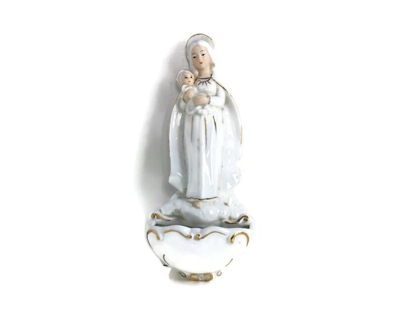 Porcelain vintage Holy water font Vessel Virgin Mary with Infant Jesus polychrome christianity