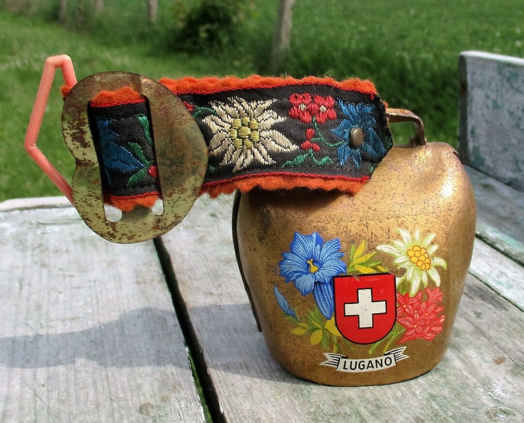 Vintage Authentic Swiss Cowbell Lugano Rustic Bell Strap Edelweiss