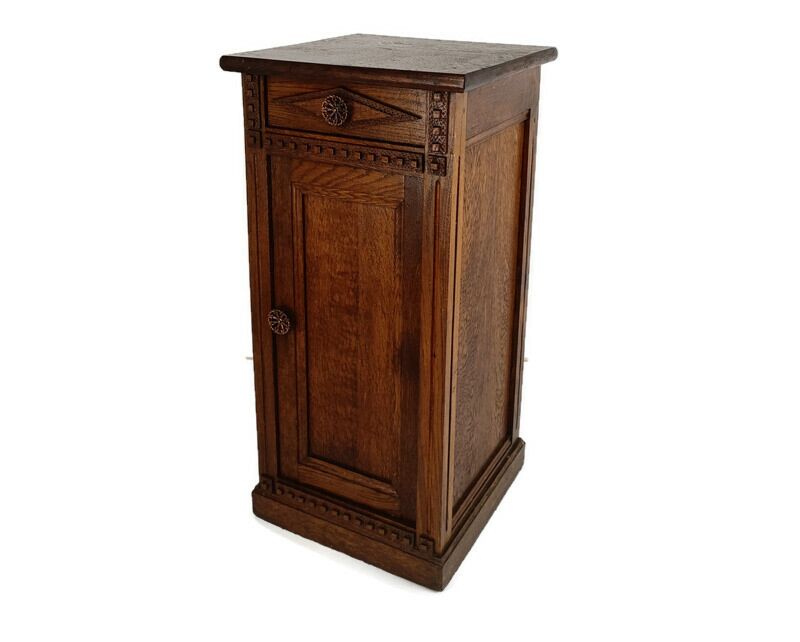 Vintage Nightstand End table bedroom cabinet Tramp Art style carved wood Oak